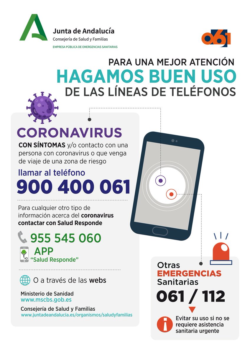 Consejeria De Salud Y Familias On Twitter Para Una Mejor Atencion Hagamos Buen Uso De Las Lineas De Telefono Lineas En Andalucia 900 400 061 Si Se Tiene Sintomas
