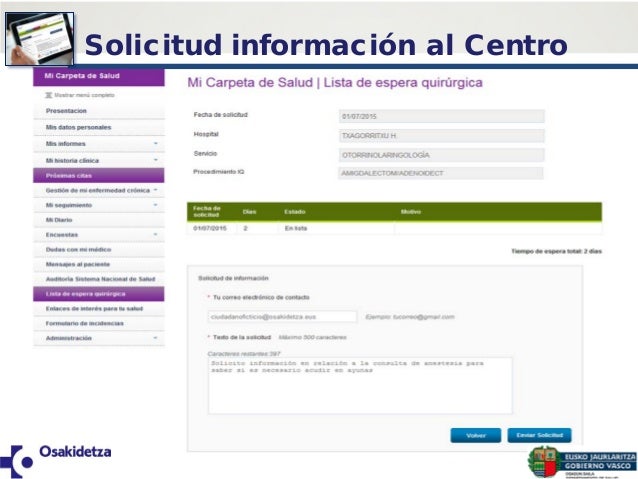 Ver tu historial farmacológico con las prescripciones y hoja. Carpeta de Salud II Comunícate con Osakidetza a través de la Carpeta de Salud consulta las dudas con tu médico mensajes al paciente listas de espera quirúrgicas encuestas enlaces de interés y formulario de incidencias. Consultar y descargar tus informes de alta hospitalaria quirúrgicos de analítica radiología y anatomía patológica así como de tu médicao de atención primaria previa solicitud.